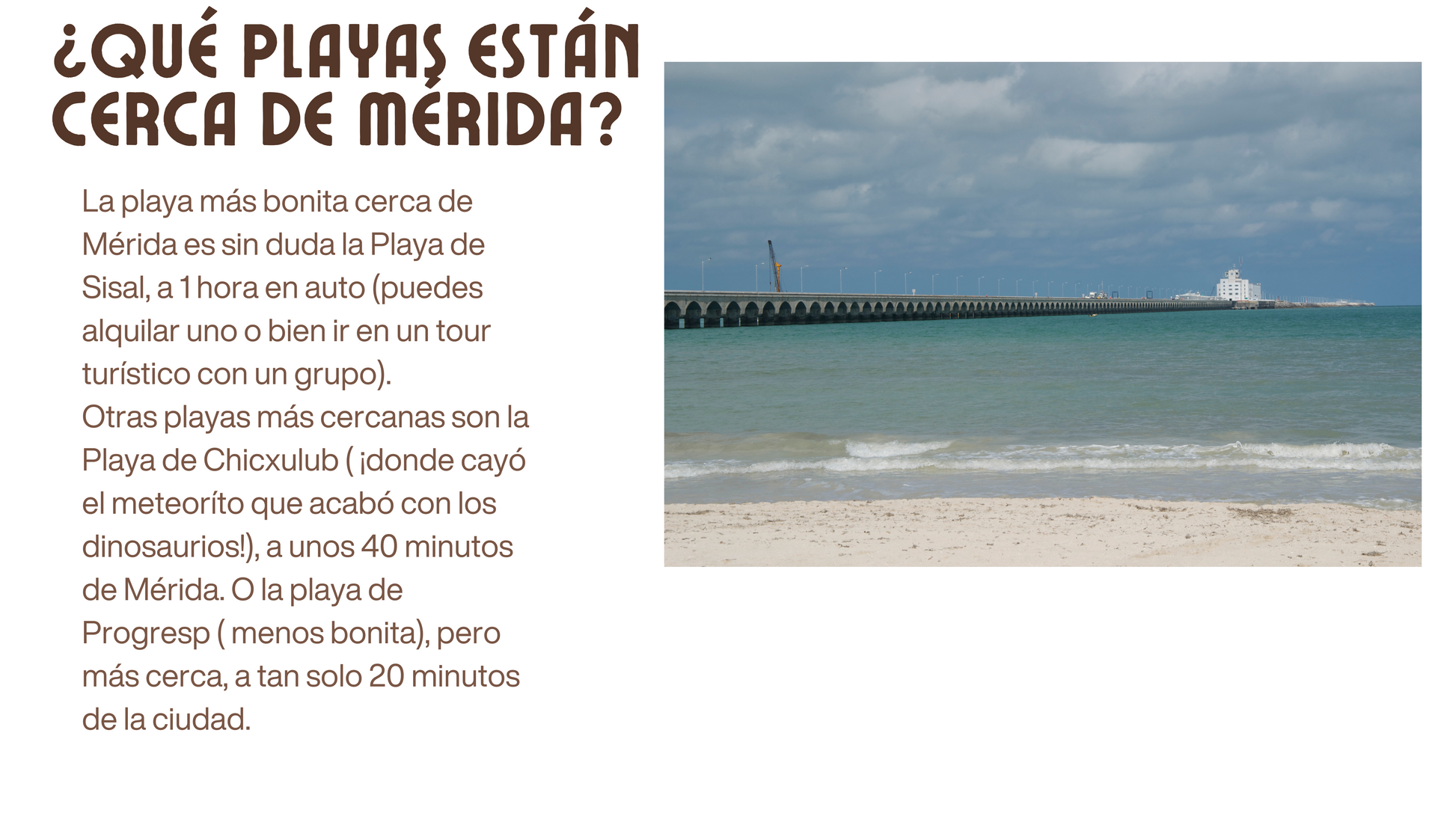 Otras playas más cercanas son la Playa de Chicxulub ( ¡donde cayó el meteoríto que acabó con los dinosaurios!), a unos 40 minutos de Mérida.